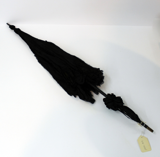 Parasol; mourning; black silk with overlays of black lace and black organdy; matte finish tube that resembles unpolished jet; silk bow fastened to handle; metal ferrule
