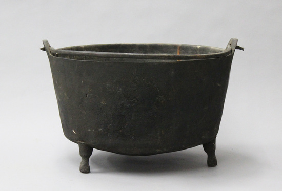 Three legged iron kettle with handle.