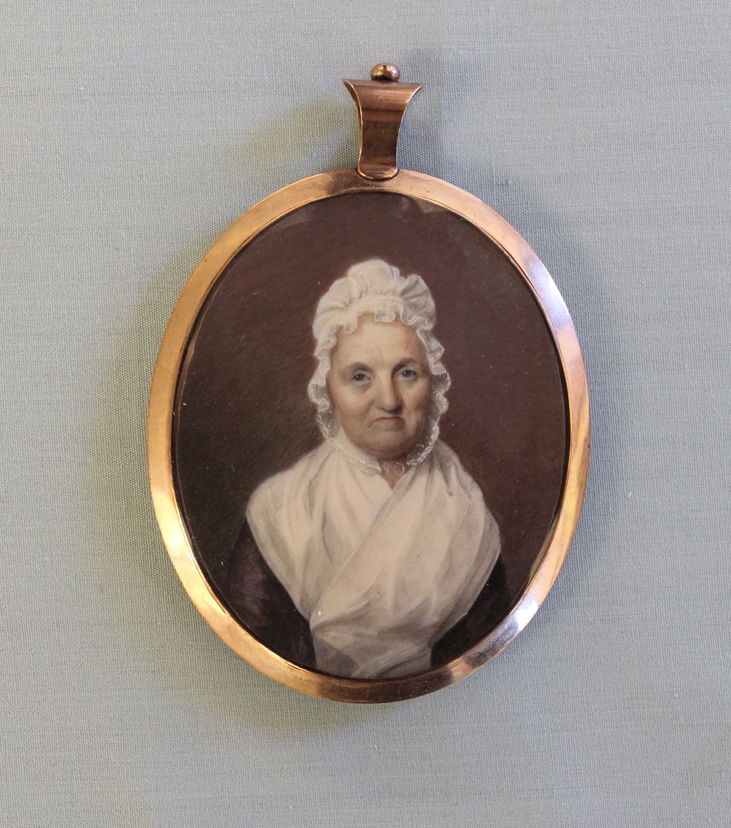 Watercolor on ivory portrait miniature of Mrs. Eliza Colden by Anson Dickinson. Bust portrait of an elderly woman wearing a black or dark brown dress with a white shawl and white bonnet. Facing front against a background of dark brown and copper hues. Oval portrait set in a copper locket under convex glass, with loop at top. Back of locket has hair reverse containing Mrs. Colden's hair in a weaved pattern. Small, incised signature on the miniature off of the left shoulder, reading "Dickinson/1805," but is barely visible. B - Outer case for locket. Oval album case of red leather with silk lining and hook clasps.