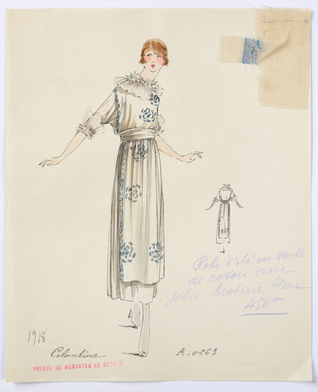 Lithograph and watercolor on paper fashion design. Summer dress in cotton voile with blue embroidery. Fabric samples accompany rendering.