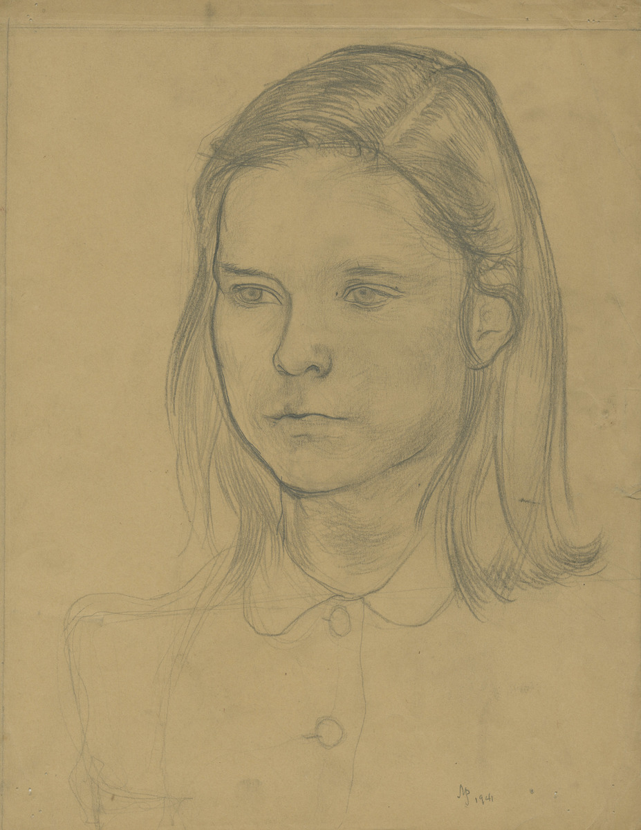 A pencil sketch on paper of a young girl. The young girl has shoulder-length hair and is wearing a colored, button-down, short-sleeved blouse. Only her left ear is visible and her face is tilted towards the left of the sketch. Her face is lightly shaded in with pencil. Initialed and dated on front right-hand corner: "AP 1941." On the back is written in large, cursive, pencil letters: "Mini Almy/AP." There are two very large lower-case letters in charcoal on the back of the sketch along with straight pencil lines and a pale pink paint splatter to the center left of the paper. Half of an "m" on the top and part of an "e" on the bottom of the paper are visible. Both letters are side-ways in relation to the label in pencil at the bottom.