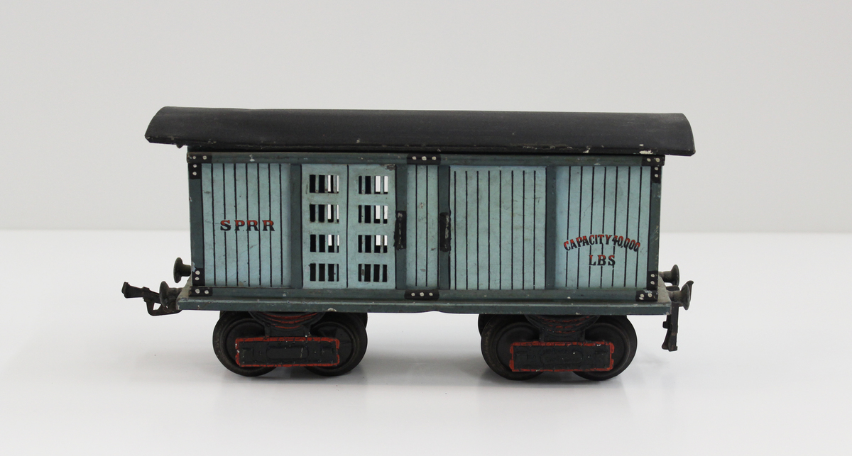 Early 20th-century tinplate boxcar, possibly made by Märklin. Rectangular car with two compartments, each accessed by two sliding doors, one on each side. The first compartment has solid sliding doors, the second has doors with open bars. The exterior of the car is painted light blue with thin vertical striping in a darker blue or black; the roof is painted black. Red and black lettering on each side reads "SPRR/CAPACITY 40,000 LBS." Buffers and car hookups at each end.