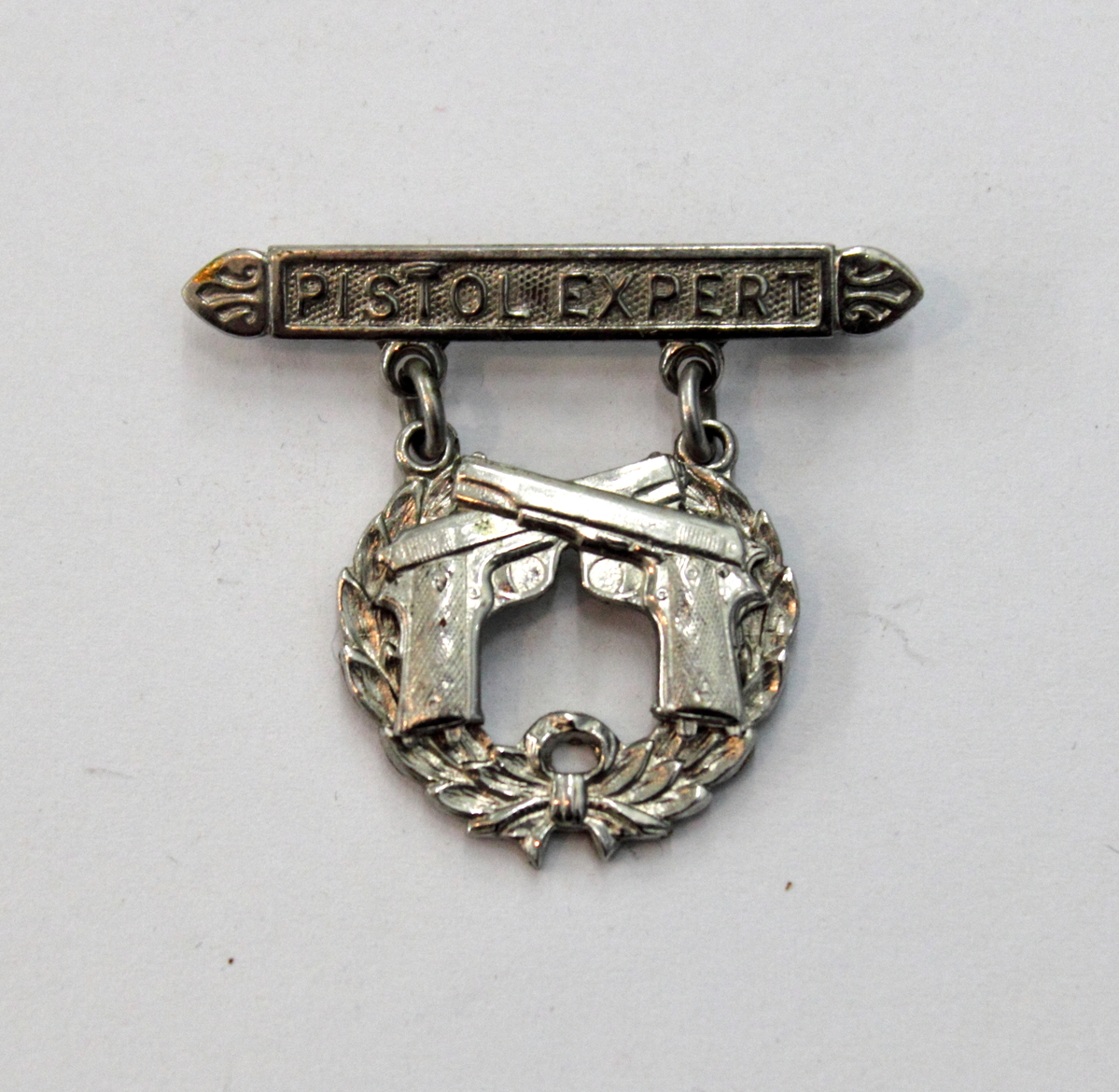 USMC Pistol Expert Qualification badge, World War II era. Metal badge attached to metal rectangular brooch. On brooch, raised lettering "PISTOL EXPERT". On back of brooch, engraving of an eagle with small lettering below it "IMPERIAL". Badge consists of image of two crossed pistols over a wreath, which is tied at the bottom with a bow.