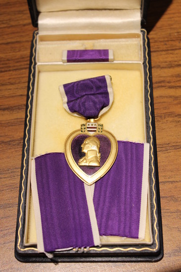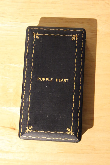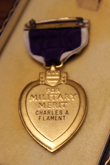 Purple heart medal awarded to Charles A. Flament, PFC in the 509th Parachute Infantry Battalion, who was killed during the Battle of the Bulge. It is possible that Flament was the first casualty from Litchfield in WWII. A - Medal, with ribbon pin. Marked "For Military Merit/Charles A. Flament" on reverse; portrait of George Washington in gold on obverse. B - Ribbon bar C - Case for medal, leather with faux velvet interior D-E - Two purple ribbon pieces with white borders