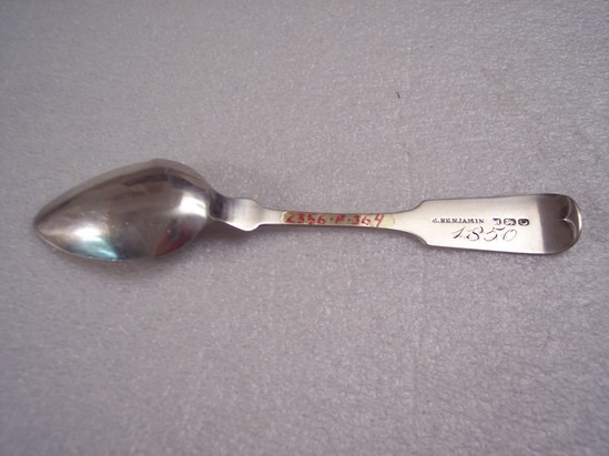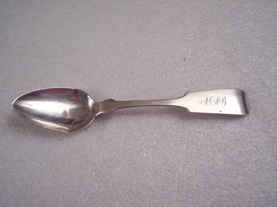 Silver teaspoon, Ensko 1810 shape. "MAB" engraved on end of handle in script. Belonged to Mary A. Sanford born in Litchfield 1825 and married to E.A. Bulkley