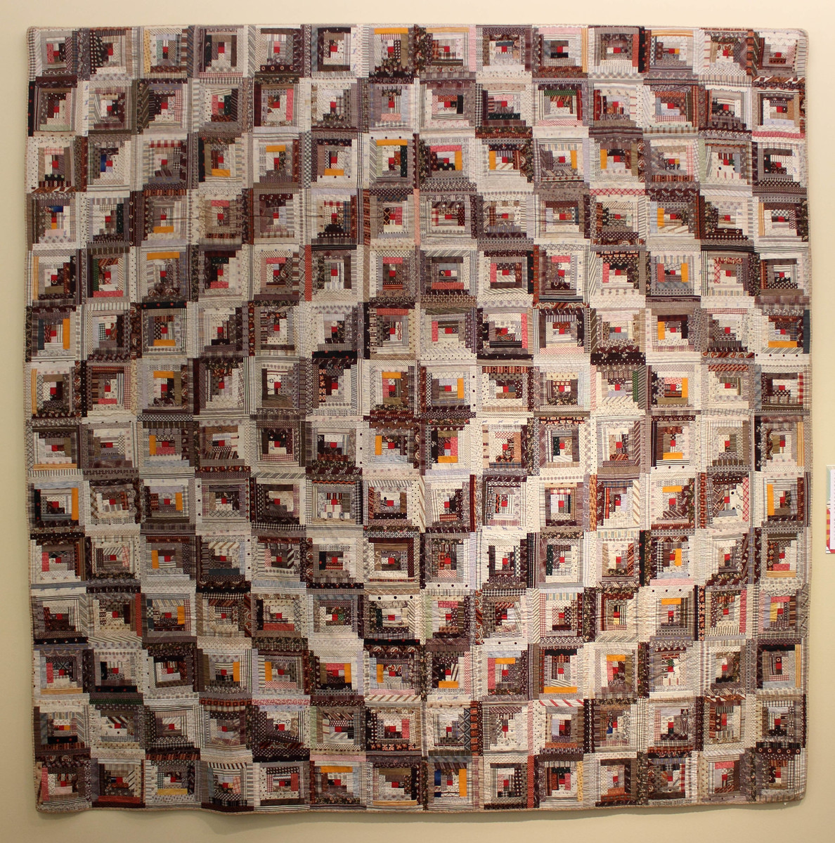 Off-white cotton log cabin patchwork quilt. Blocks have calicos, stripes, plaids and solid fabrics. Colors of browns, golds, blues, greens and reds. Hand stitched and quilted. No batting. Striped floral fabric back. Bound edges.