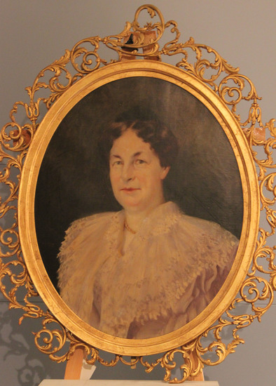 Oval shaped portrait. Older woman - facing slightly to the left. Brown hair parted down center, pulled back and piled on head. Blue eyes. Gold rope twist necklace. Large white lace layered shawl over light blue dress. Wooden frame with carved scrolls around outside edge, gilded