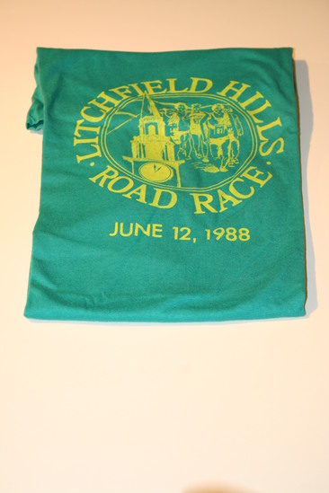 Teal short sleeved t-shirt. Logo on front center of shirt, printed in yellow. "Litchfield Hills Road Race" printed around outer edge of logo. "June 12, 1988" printed below logo.