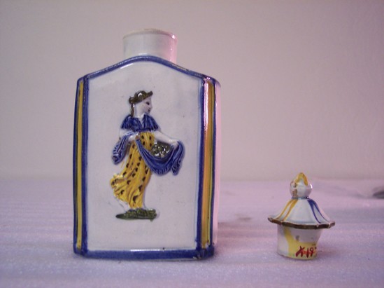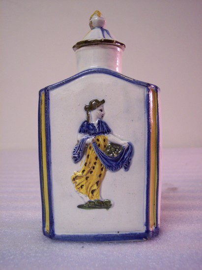Oblong, white china tea caddy with blue and yellow trim on 4 corner panels. Raised relief and painted antique female figures on long sides of caddy. Arched lid that is decoratively molded and has a round, spout-shape. Lid is marked "X-1" on the inside.