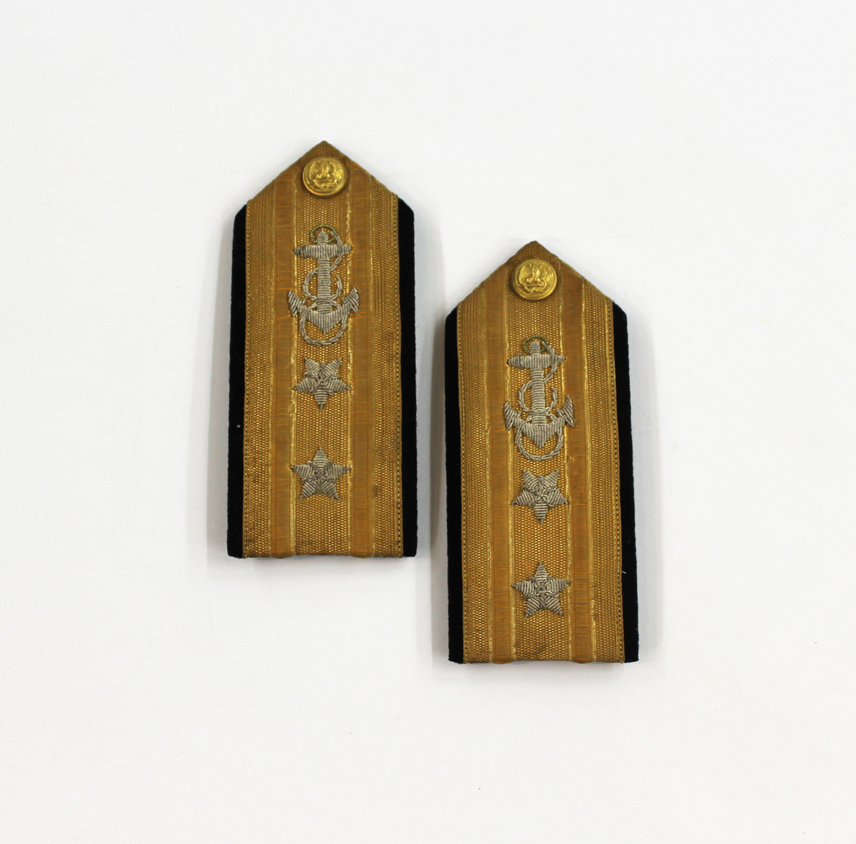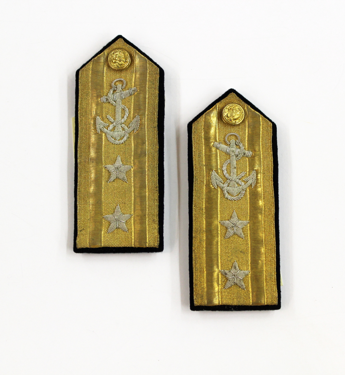 Two sets of Navy shoulder boards and manufacturer's enclosures issues to Rear Admiral Charles L. Hussey. A,B - Pair of matching shoulder boards. Square at one end and pointed at the other. Metallic thread stitching on black velvet with two silver stars and a silver anchor, denoting the rank of rear admiral. Gold button at one end bearing emblem of an eagle holding an anchor. Black silk on bottom with black leather strap. Stamped in gold with manufacturer's mark, N.S. Meyer, Inc., New York. C,D - Pair of matching shoulder boards. Square at one end and pointed at the other. Metallic thread stitching on black velvet with two silver stars and a silver anchor, denoting the rank of rear admiral. Gold button at one end bearing emblem of an eagle holding an anchor. Black leather on bottom with black leather strap. Stamped in gold with manufacturer's mark, Joseph Starkey, London. E - Rectangular cardboard box with two was paper sleeves marked "N.S. Meyer, Inc." One sleeve has paper label indicating it was ordered for "Admr C.L. Hussey."