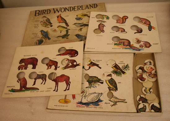 Box with game inside. Bird Wonderland. Box contains cardboard sheets of animals. Heads have blank circles over them. Box contains series of circles with images of animal heads printed on them. Child would have to match animal head to body of animal.