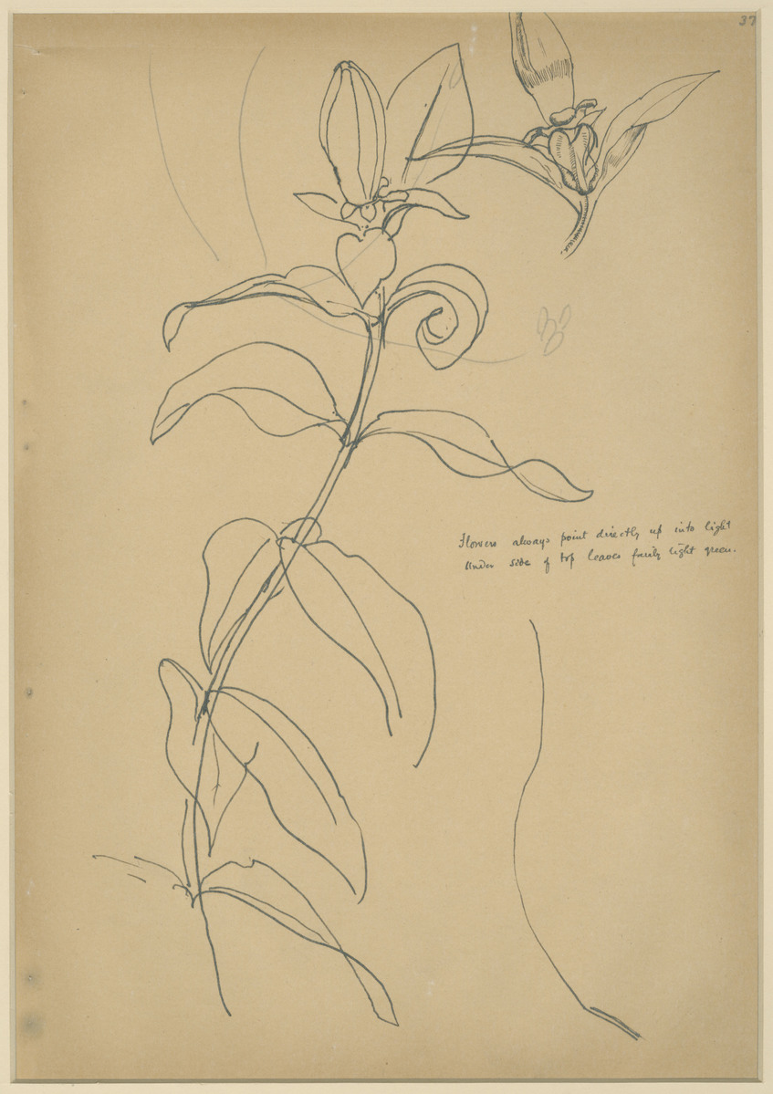 Pen and ink sketch of a day lily on paper. The center flower has a stem which extends downward to the bottom of the piece. In the top right hand corner is a close-up sketch of the flower without a stem. There are some pencil marks made towards the top of the lily that appear to have been made by the artist. In the top right hand corner is the number 37 in pencil. In the center of the right hand side of the paper are two lines of words written in black ink which read: "Flowers always point directly up into light/under side of top leaves fairly light green." Matted, date not given.