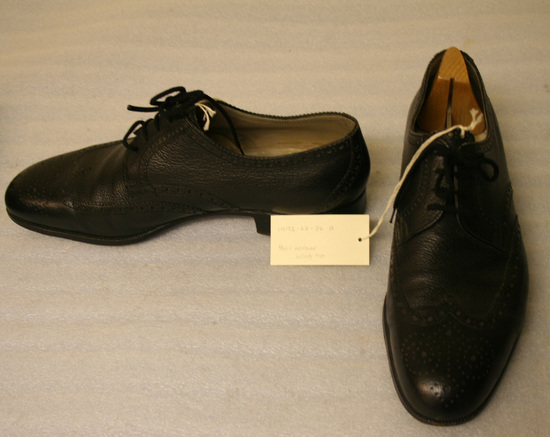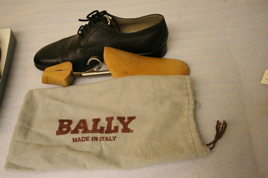 Black leather wing tips with nylon laces; contain shoe forms; label on shoe illegible but appears to be in German; shoes in gray flannel bags marked "Bally/Made in Italy"