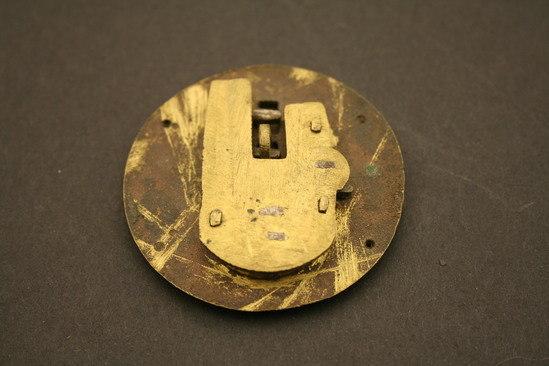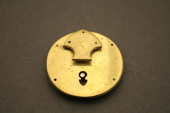 Round brass lock, key hole at center bottom; two small holes opposite each other on outer edge; piece at top shaped like the head of an arrow with a short neck; three small holes in head, loosly attached to lock; back has locking mechanism but covered with brass plate