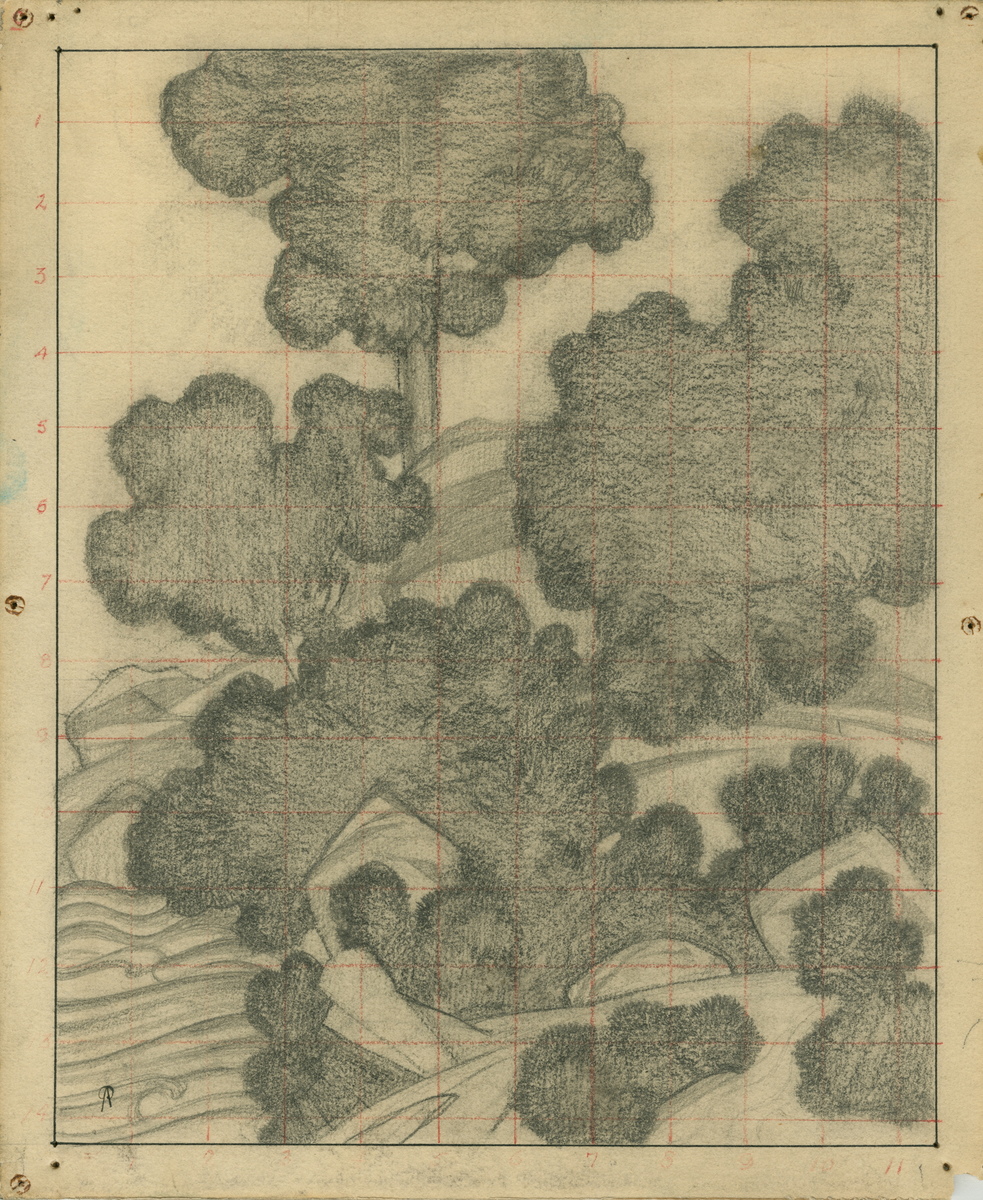 Pencil and charcoal sketch of clouds and sea in red-pencil quadrille on board. Written on back in black ink and blue pencil: ""New England Shore"/Thomas J. A. Johnson Residence/ Reception Room Decoration/Austin Purves Jr./1927/IV."