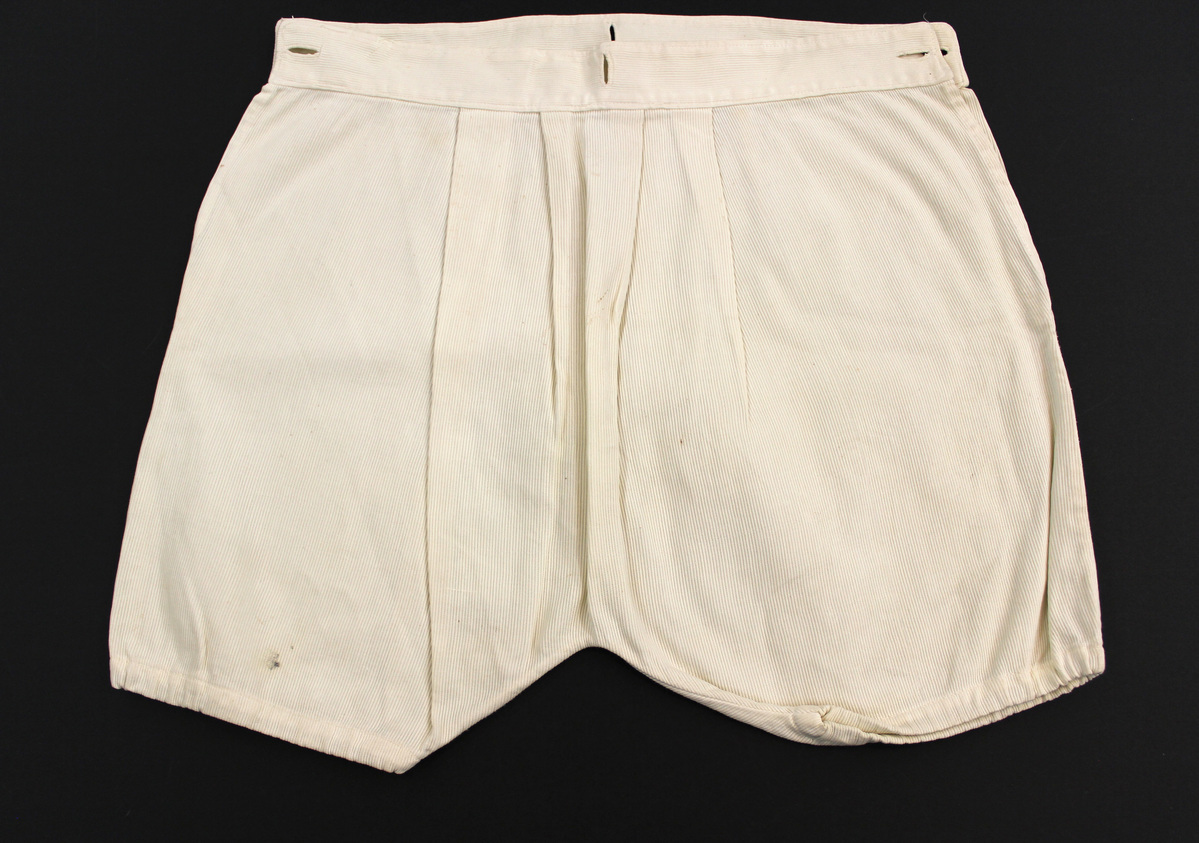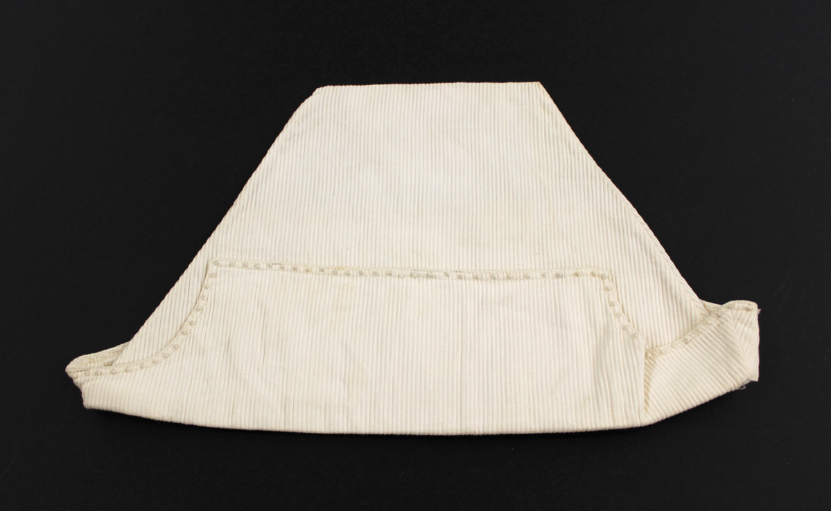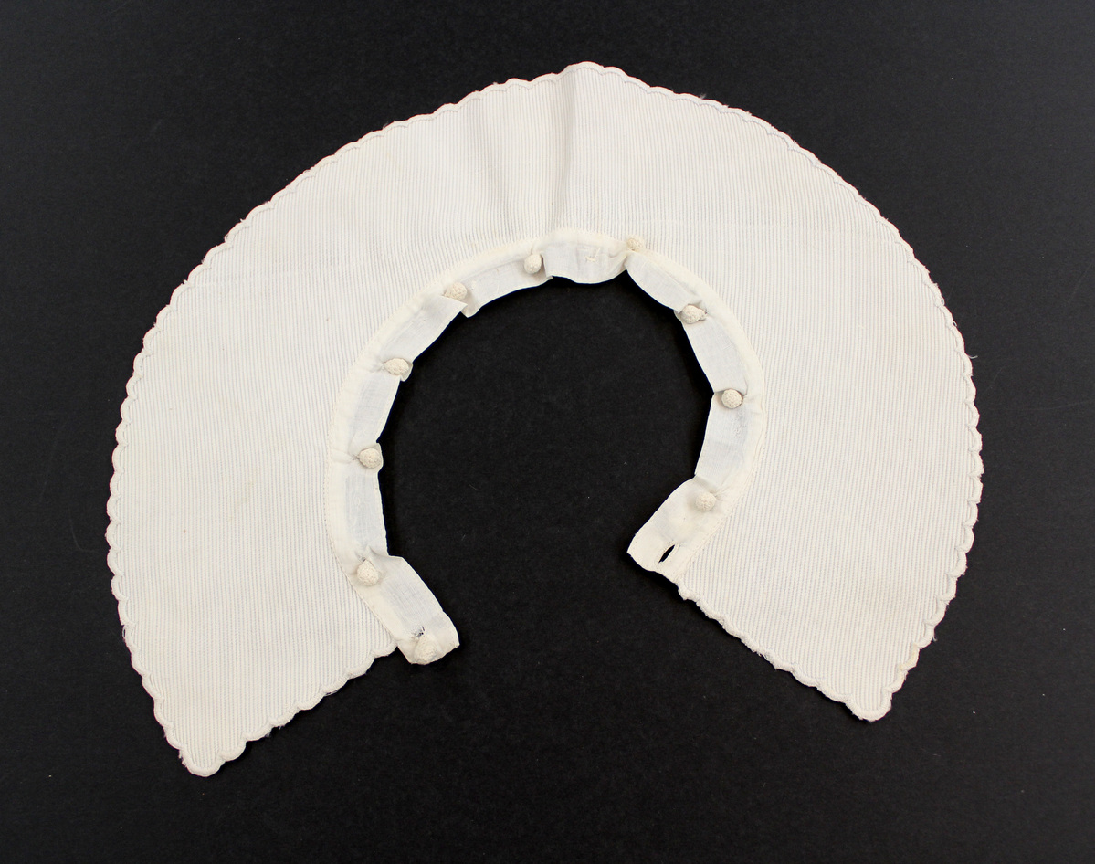 a: Collar: White ribbed cotton child's round collar with embroidered scalloped edge; ten crocheted buttons along neck edge b: Hat: White matching ribbed cotton child's hat; square-topped with fold-up brim; French knots on edge c: Pants: White ribbed cotton child's pants / knickerbocker trousers; pleated; elastic gathered legs; button holes at side front and back waistband.