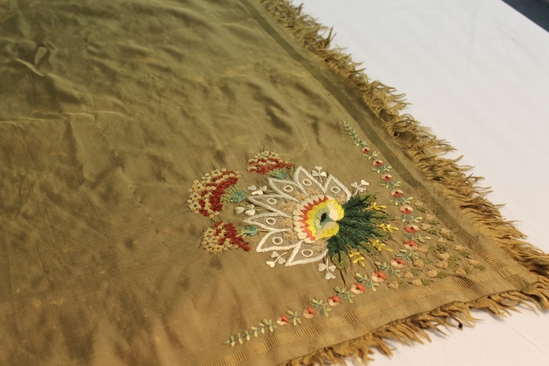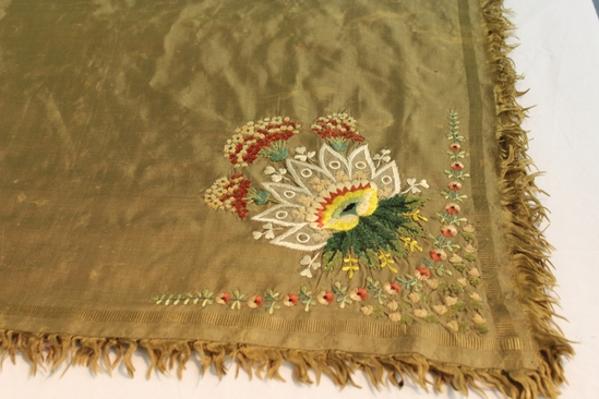 Olive green silk shawl. Multi-colored floral motif at one corner. Fringe (1.5") all around edges.