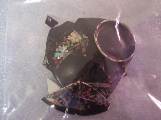 Teacup cover is white porcelain covered with black, cold-painted enamel. Mother-of-pearl floral designs. Interior is white.