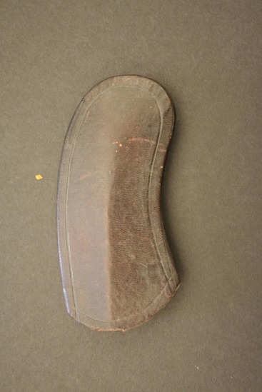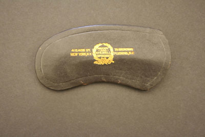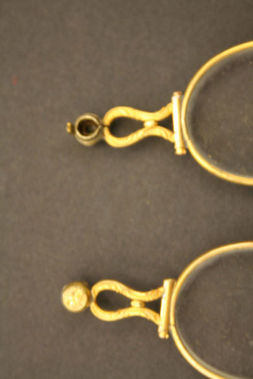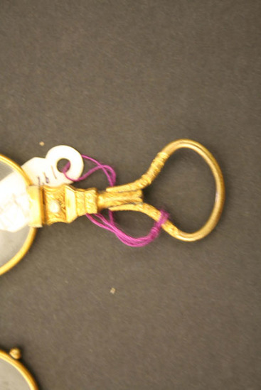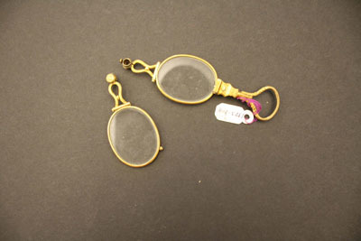 Oval lenses with carved gold frames. Loop at one end. Hinge broken. Case black paper with stamped gold lettering reads "McCoy and Stilwell Opticians/41 E. 42nd St. New York, NY/ 78 Broadway Flushing, NY"