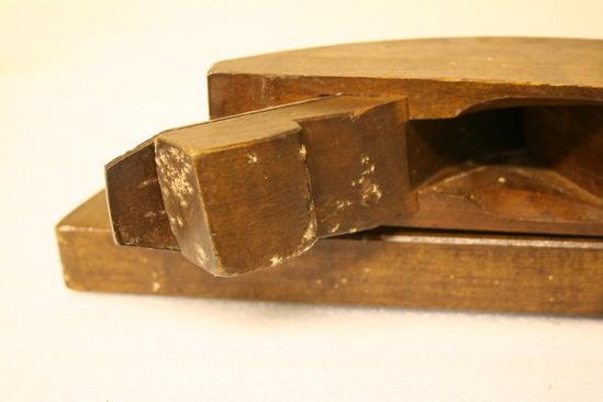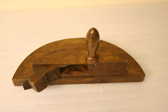 Wooden cooper's plane, made of hard maple. The plane consists of two semi-circular pieces of wood, one much larger than the other. The small semi-circle is mounted along the bottom edge of the larger semi-circular piece. An angled rectangular shaped hole is cut into the bottom of the small semi-circle. An angled blade with a wooden wedge protrude from the hole. There is also a small slit at the top of the smaller semi-circular piece where the sharp end of the blade protrudes slightly. There is a shaped wooden handle attached perpendicularly to the plane. Stamped on one side "J. Bradford/Portland"