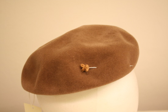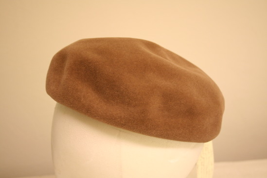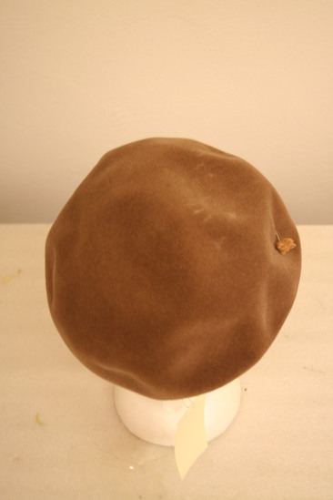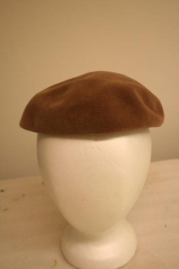 Circular and shallow in shape; light brown velour hat with brown grosgrain ribbon band in interior; hat pin with brown cloth tip attached; hair comb attached to front center; Label "Hattie Carnegie/Velour de Soie/Body Made in France"