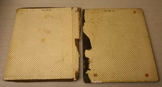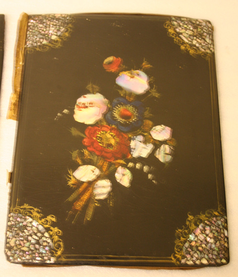 Portfolio - now broken into two pieces. Backside plain black paper. Front side has painted bouquet of red and blue anemones with mother of pearl accents. The corners of the portfolio have small pieces of mother of pearl and the whole is painted and varnished with colors. Interior lined with printed paper.