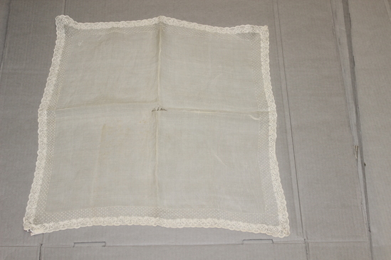 White silk handkerchief. Lace border of net with repeating design of small dots and border along edge of floral design. Scalloped edge and rounded corners. "Julia L. Belden" written in center in ink.