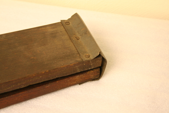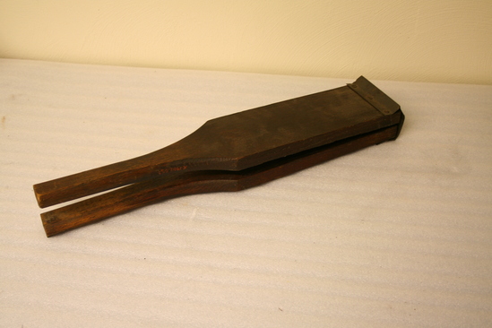 Two rectangualr shaped paddle with handles on one end. On other end joined by a piece of tin. Tin allow paddles to be pressed towards each other but allows paddles to spring apart when tension is released. Used for pressing lard