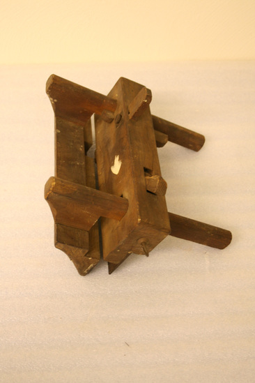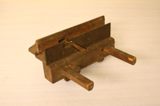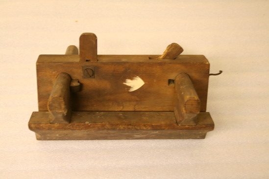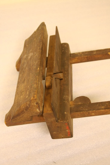 Rabbet, type of plane. Base of rabbet triangular shaped piece of wood with two circular rods at top perpendicular to base. The two rods pierce through a second piece of wood that holds a large iron blade in place. The blade lines up along one side of the triangular shaped base. There are two small wedges of wood protruding from the top of this second piece of wood. One of the wedges is held in place with a large iron screw and the other is pushed into an angled hole curved in the top. The two cylindrical rods extend through this piece of wood and out onto the other side.