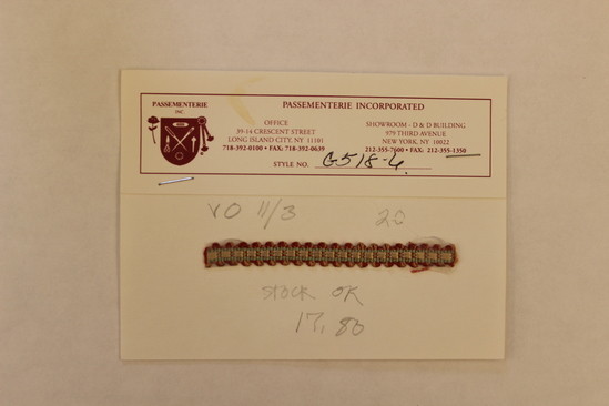 Two strips of silk trim attached to cards. Strips are light green with peach rectangles running horizontally. Each rectangle is attached to the next with two horizontal red line segments. Small loops of peach and red thread line the top and bottom. Rectangles are slightly raised from the background.