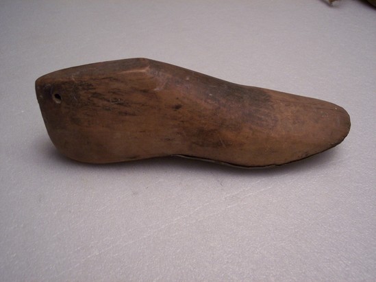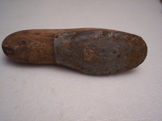 Wooden shoe mold. Hole drilled in back of heel. Bottom of mold has large iron plate that covers half the length of foot. Held by nails