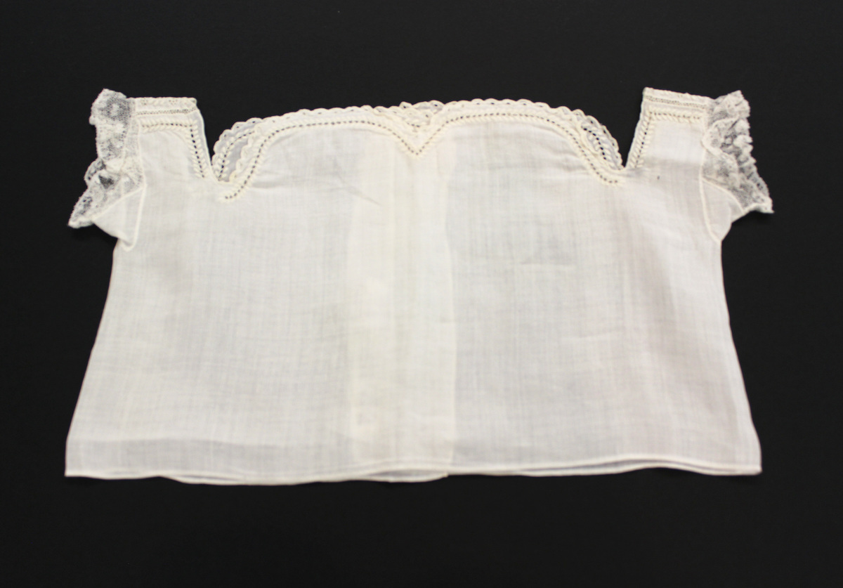 White cotton child's shirt; lace trim on armholes; embroidered shoulders and neckline; scalloped eyelet edges on collar; back open with no closures