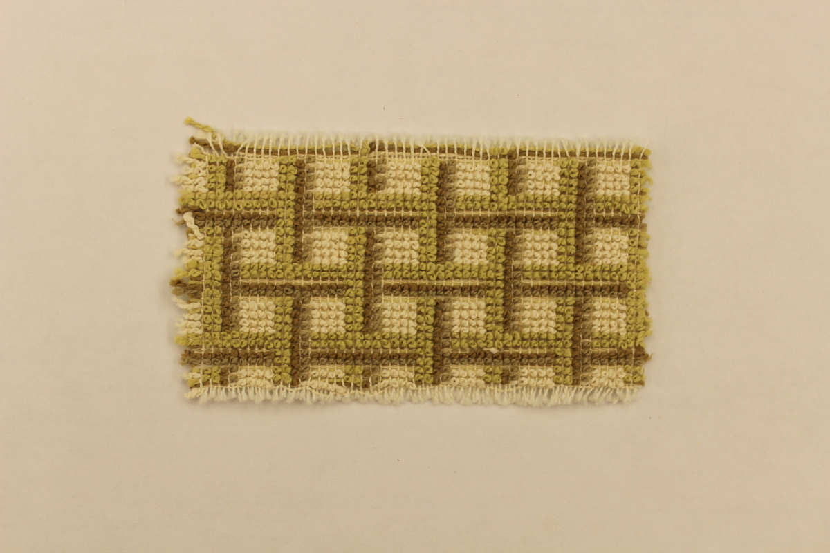 Rectangular fabric swatch made of cotton. Swatch has a pattern of white square, outlined with light green and olive green lines. Fabric has an open weave and is rough and thick to the touch. Marks: Sticker on back with sample information and manufacturer name.