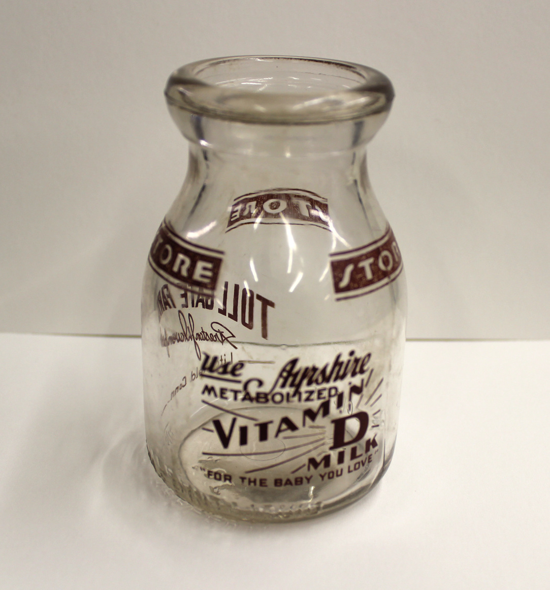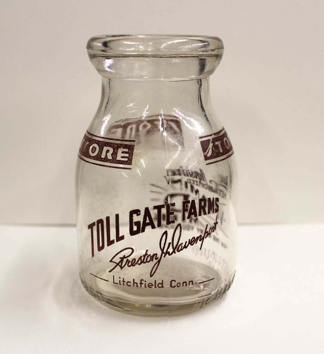 Glass milk bottle with round lip top, circular bottom, and tapered sides. Half pint. Painted lettering on one side, in red, "TOLL GATE FARMS/Preston J. Davenport/Litchfield, Conn."; on reverse side, in red, "Use Ayrshire/METABOLIZED/VITAMIN/D/MILK/FOR THE BABY YOU LOVE"; and around the rim in three places, in red, "STORE." Embossed lettering on one side, "REGISTERED," and one reverse side "MTC HALF PAINT LIQUID/SEALED II." Embossed lettering on bottom, "46E/MTC." Pressed glass with mold lines on sides and circular mark on bottom.