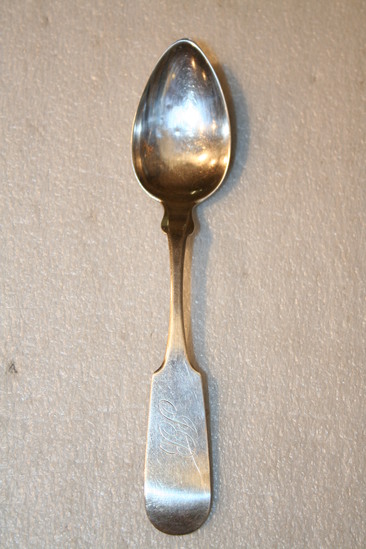 Silver teaspoon with the initials "JB" engraved on handle. The reverse side has the name "R.MERRIMAN" stamped into the handle along with the phrase "PURE COIN". The bowl of the spoon is pointed at the end rather than rounded.