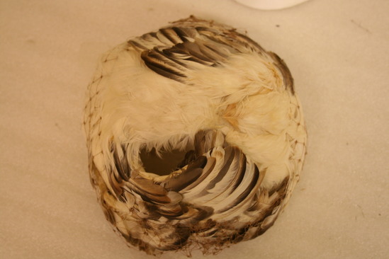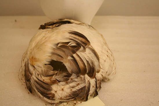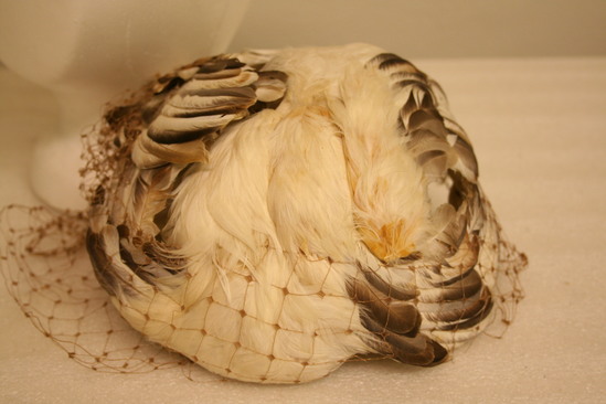 Circular in shape; hat covered with feathers; darker in front and back and white in center; brown netting attached an inch from brim hanging down; label "Rose Valois/18 Rue Royale Paris"