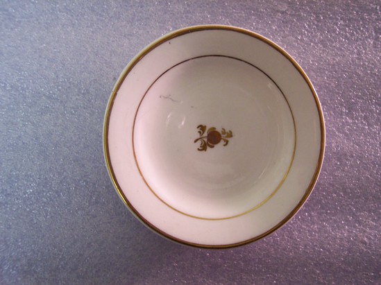 Small, white round plate with gilt line rim and inner circle. Small, gilt floral spray in the center of the plate. Wide foot rim.