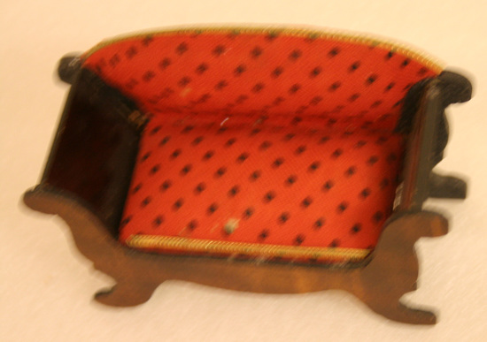 Doll furniture sofa - empire style with dark veneered wood, red tapestry upholstery with black dots, gold paper trim.