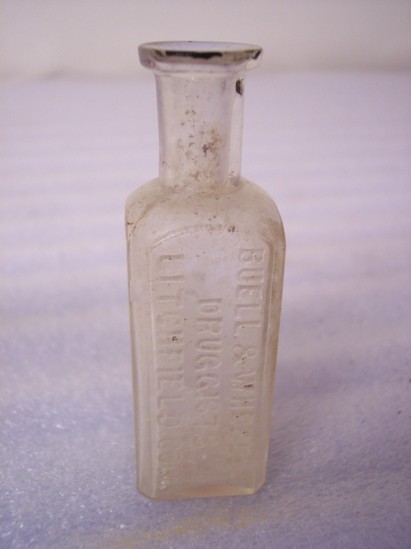 Clear glass, made in two molds, bevelled corners, rounded shoulders, neck and wide rim. On one side "Buell & Wheeler/Druggist/Litchfield, Conn"