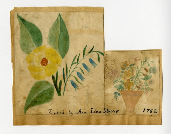 Watercolor on paper executed by Ann Idea Strong. A yellow flower with green leaves, flanked by a thin branch with four blue tulips on left. A multi-colored floral bouquet in vase on right. "Painted by Ann Idea Strong 1769" in black along bottom.