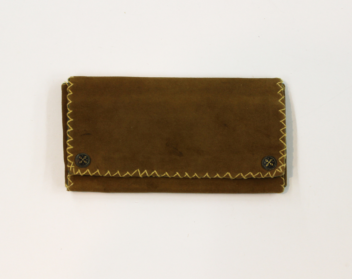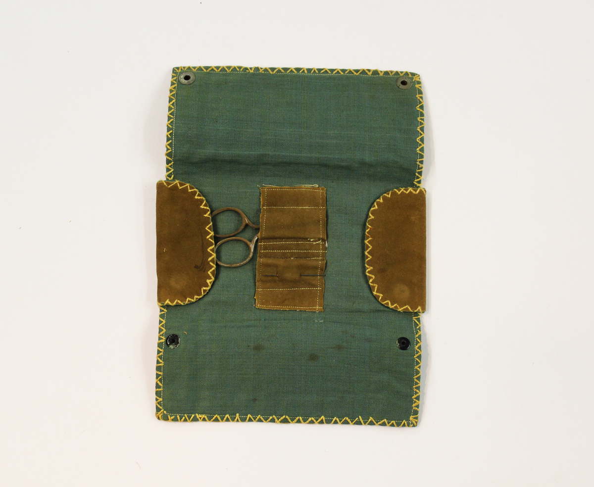 Small sewing kit. Brown leather (suede) exterior with green linen lining. Edges accented with yellow cotton thread stitched border. Two metal snaps at front corners to close. Pierce of suede sewn in center and stitched to create pockets. Small pair metal scissors and single needle inside. Three cards in sewing case. "For excellence in Sewing/ The Mary Perkins Quincy Memorial/ in the/ Public Schools of Litchfield, Connecticut/ Prize Winner/ Mary Comporesi/ June 1924" printed in red and "Cora Towne Fund/ prize/ Mary Comporesi/ Grade 6" written in ink. "Mary Comporesi/ for/ perfect attendance" written in pen on back of calling card of Mrs. Harold Kirtland Switzer. Cards are now located in accession folder.