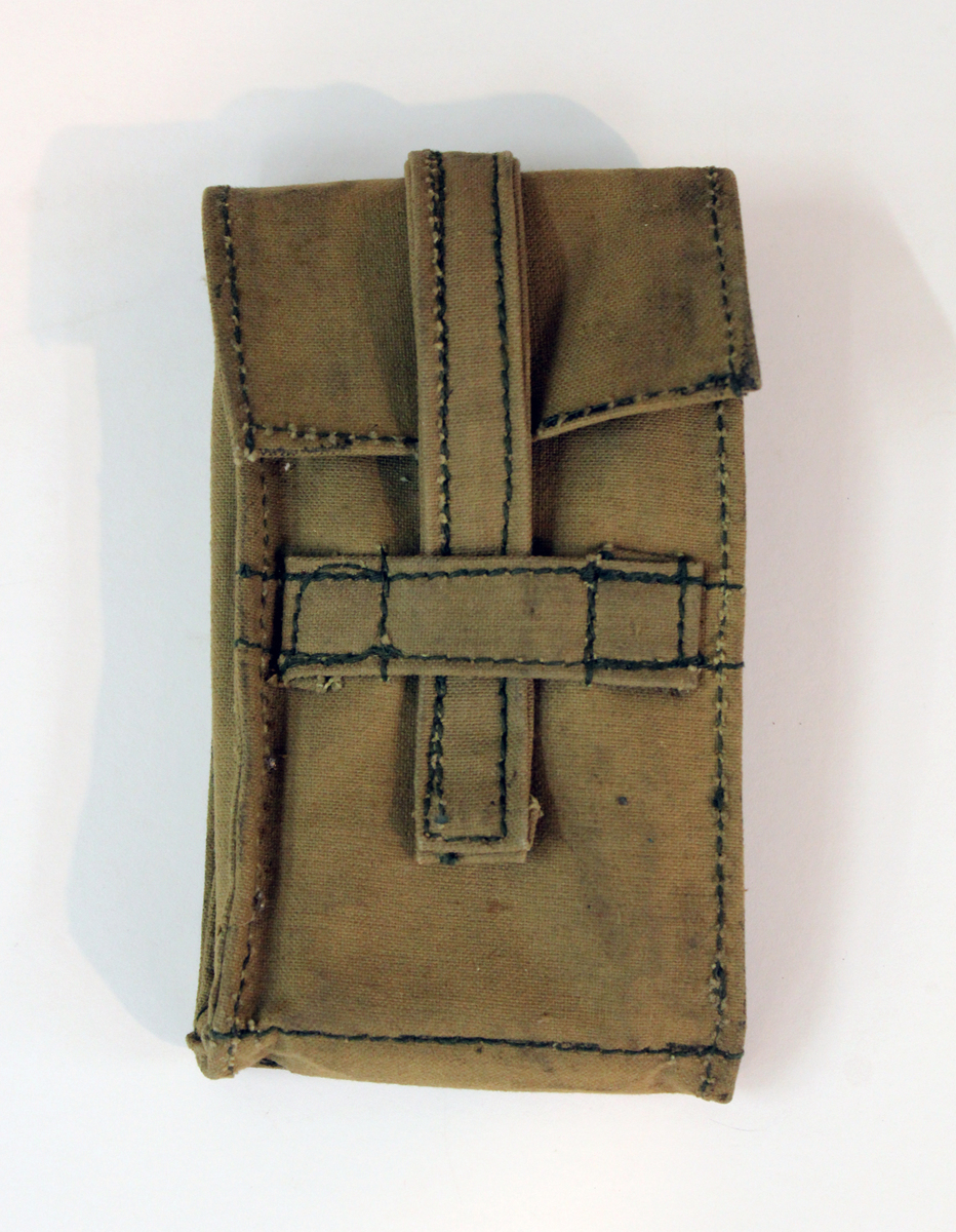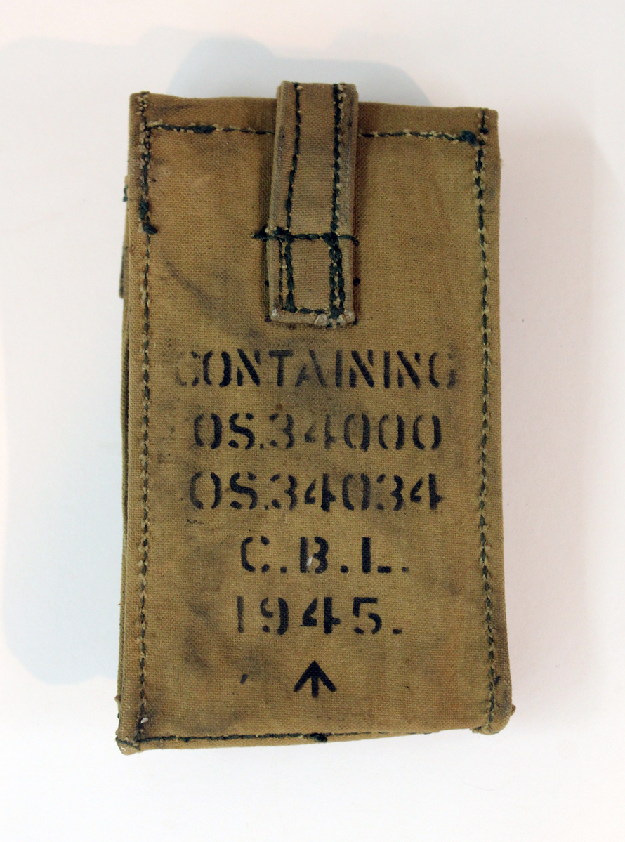 Khaki cotton canvas pouch, World War II era. Cover has canvas strap that slides into a loop on the front of the pouch. Three interior compartments. Stenciled lettering on back, in black ink, "CONTAINING/OS34000/OS34034/C.B.I/1945."