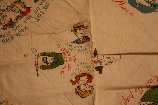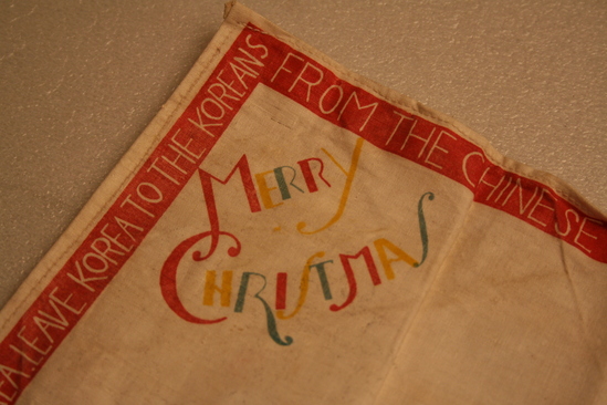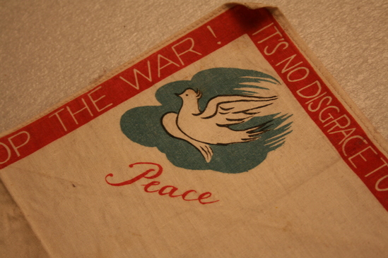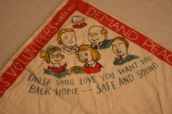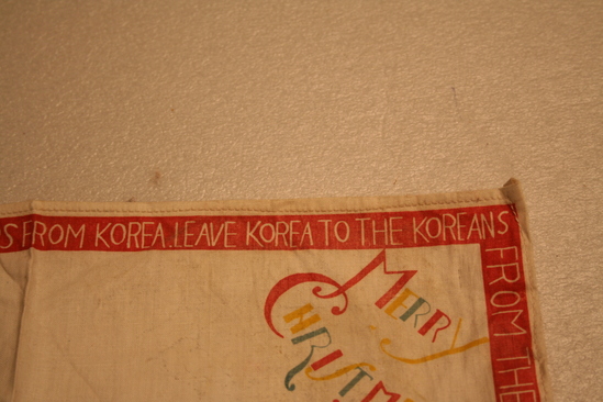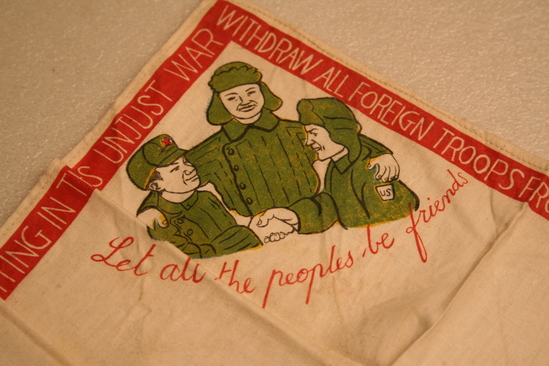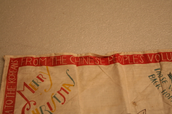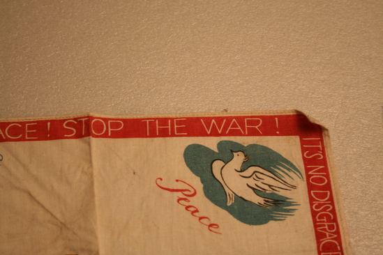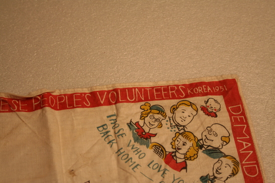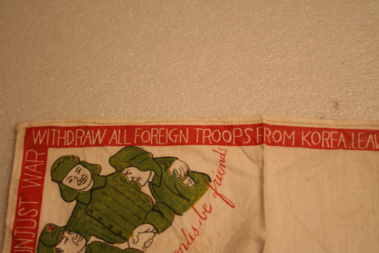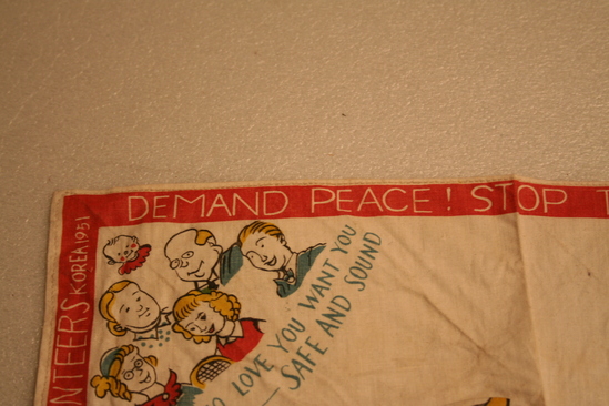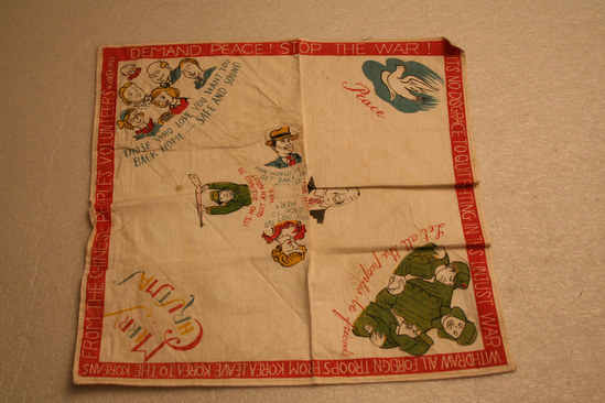 Square handkerchief, white. One side has red border with words printed in white "Demand Peace! Stop the War", "It is no disgrace to quit fighting this unjust war", "Withdraw all foreign troops from Korea. Leave Korea to the Koreans", "From the Chinese People's Volunteers, Korea 1951" Various images on handkerchief - one corner "Merry Christmas" printed in red, yellow and blue lettering. White dove with word "Peace" in another corner. 3 men wearing green military clothing with words "Let all the People be Friends" underneath. In anther corner group of people, various ages, with words "Those who Love you Want You Back Home - safe and sound" In center are images of four different people - Military man with gun held over his head "It is no Disgrace to Quit an Unjust War", a woman "Why not go back to her", a man with a dollar sign across his chest "Why Fight for him", and a man in a hat "How would it be to get back into Civvies"