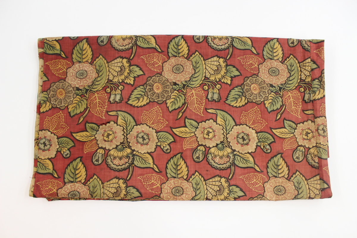 Large textile fragment. Four pieces of 26" wide each sewn together. Three sides hemmed and forth is a selvage edge. Block printed design in red, yellow and green of large flowers outlined in black. Background of fabric is red.