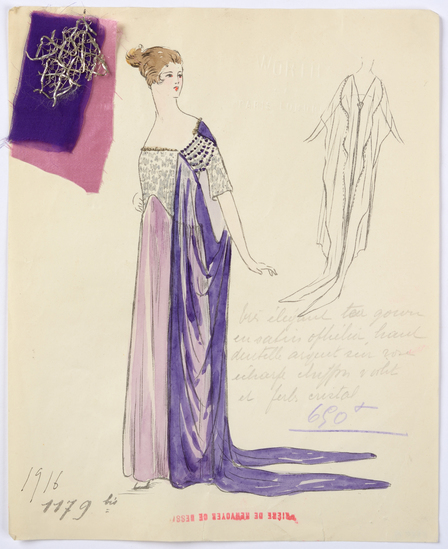 Lithograph and watercolor on paper fashion design. Tea gown in Ophielia satin with silver lace over rose chiffon with violet and crystal beads. Trailing scarf of violet. Fabric samples accompany rendering.