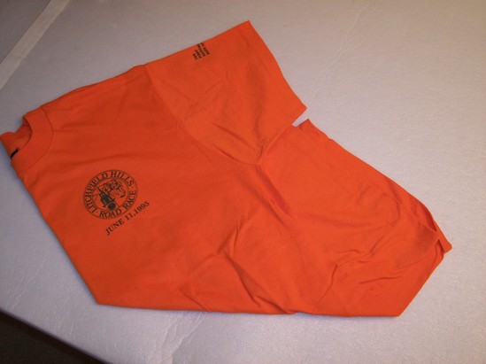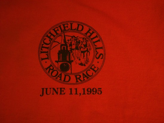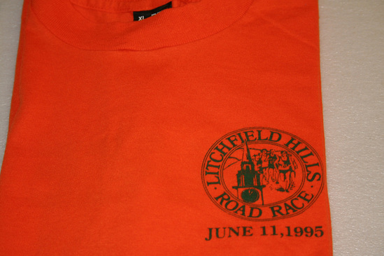 Orange, short sleeve T-shirt. Printed on front left side of shirt is logo for Litchfield Hills Road Race. Circle with Congregational Church steeple and pack of runners inside. Date "June 11, 1995" printed underneath. Logo and date printed in olive green. "The First National Bank of Litchfield" printed in olive green on left sleeve. "Race Official" printed in olive green across back of shirt in large block letters.