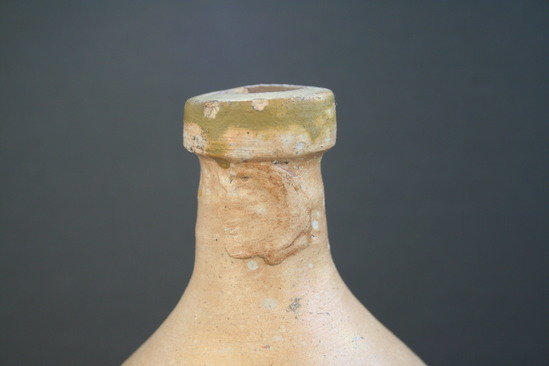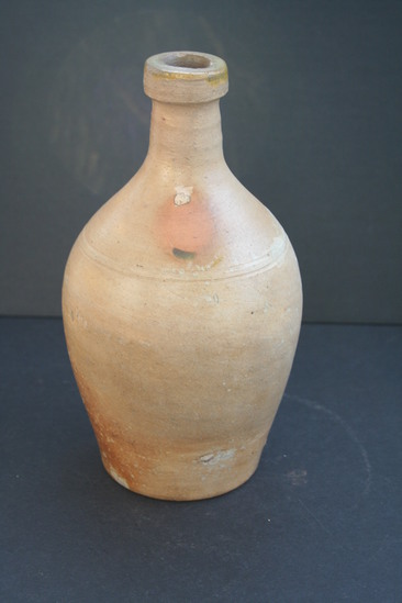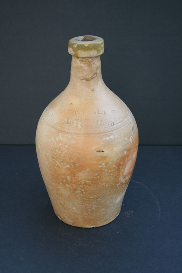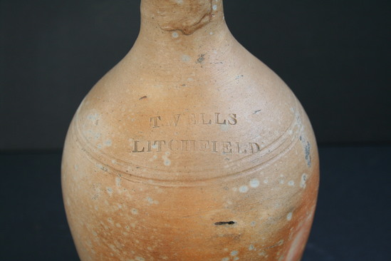Stoneware bottle with buff colored glaze. Narrow neck with pronounced lip. Bottle widens toward center and then decreases in circumferance towards bottom. Two incised lined just below shoulder of bottle. "T. Wells/Litchfield" impressed just above lines