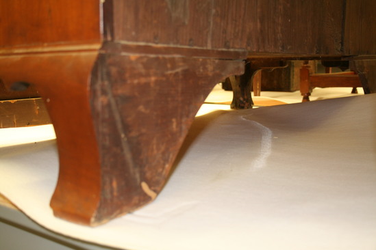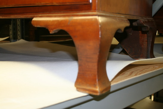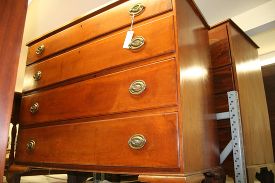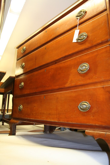 4 drawer chest; cherry; on four cabriole feet, 6 3/4" high with curved brakcet; 1/2 round at bottom with four graduated drawers (largest on bottom, smallest on top) with oval brass plate and bail handles. Handles 2 1/2" high x 3 1/2" wide. Brass key hole for each drawer. Curved back edge to all drawers. Through tenons on the back of the chest and two large cleats holding the top of the chest to the backboard - very characteristic of a piece of furniture made in Litchfield County