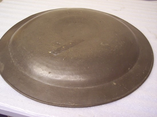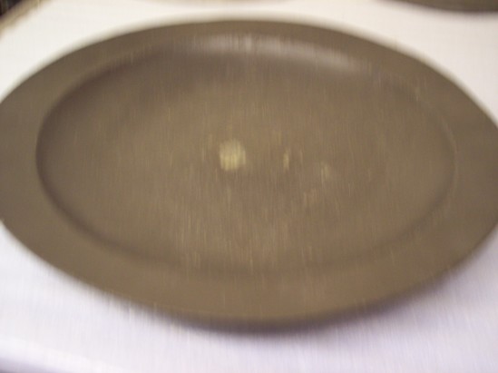Large pewter plate, shallow with 1 1/2" brim, single reed on back fo plain brim. Marks on back of plate "C" "I" "E" 4 touches that are mostly indecipherable on rim.