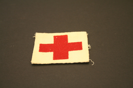 American Red Cross patch, possibly hand made. White colored piece of canvas with ends folded over to create a clean edge. Large red cross in center stitched with red silk thread.